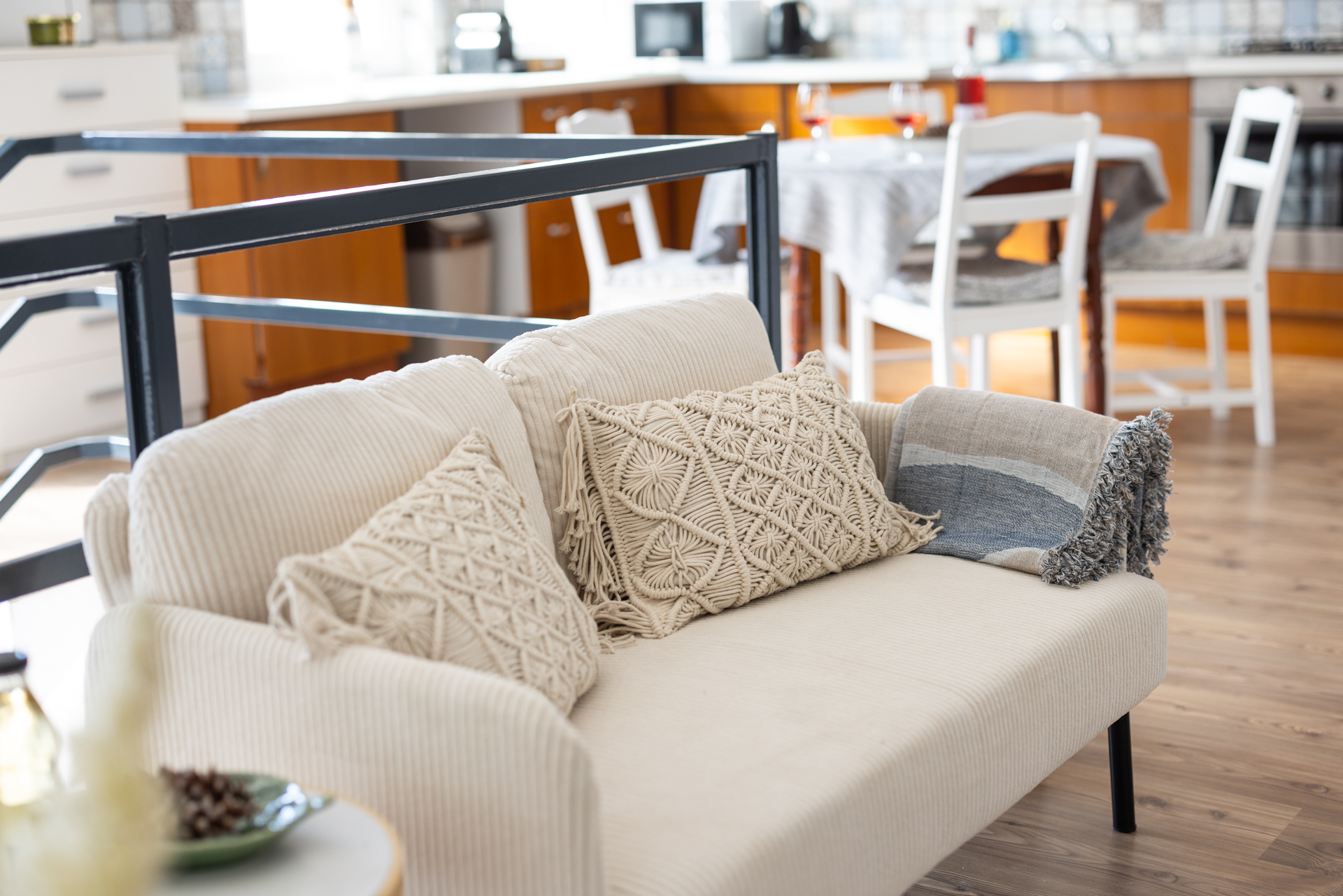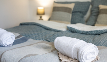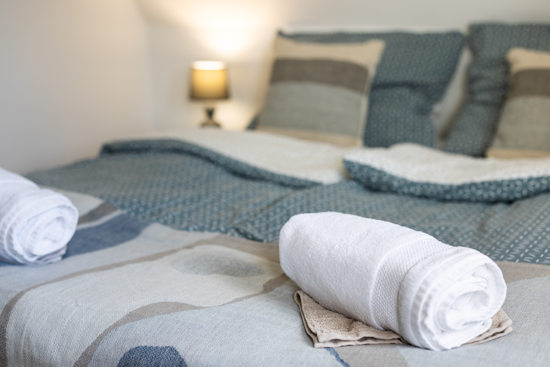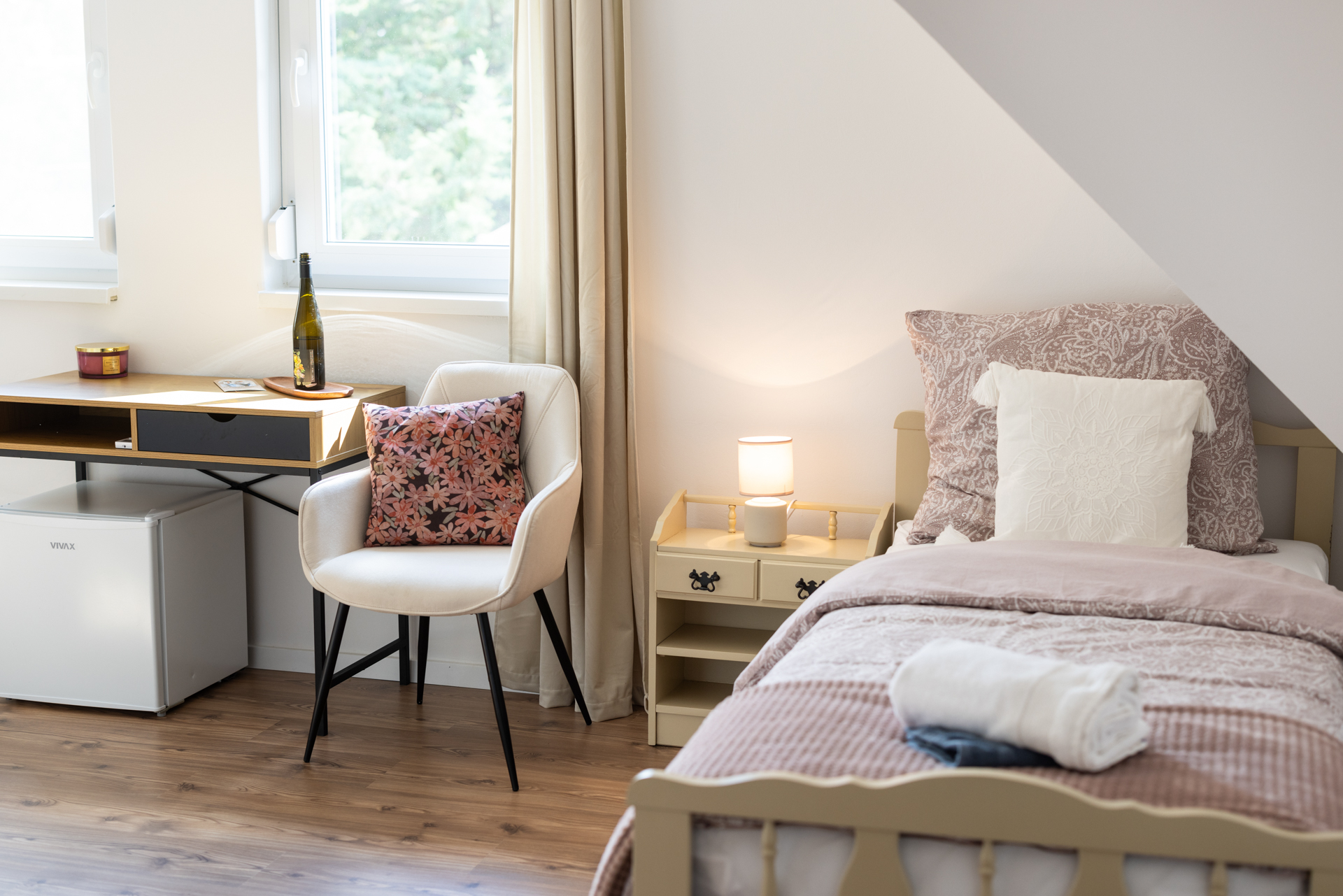 Our guest house offers two double rooms and one twin room. Extra beds can be added to all rooms, and we can also provide cots for small children. All three rooms are air-conditioned and have their own bathroom. The bathrooms are equipped with shower cabins, and we provide toiletries, towels, and bath towels for our guests. Our rooms have minibars, from which our guests can enjoy wines from our own winery. The three rooms share a spacious, well-equipped kitchen and living room. The living room opens onto a cozy little playroom for children, which is equipped with storybooks, puzzles, a dollhouse, and coloring books for the little ones.