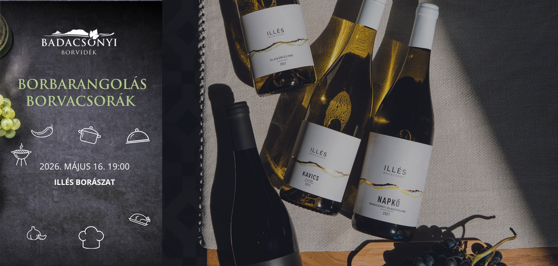 Nagy szeretettel hívunk 2026. május 16-ai borvacsoránkra, ahol a kiváló minőségű ételek mellett megkóstolhatjátok a badacsonyi borászok pincéiben őrzött legzamatosabb borokat is.